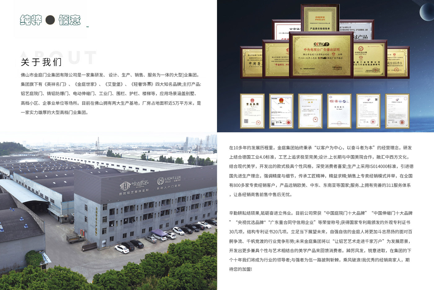 辛勤耕耘結碩果,砥礪奮進立偉業。目前公司榮獲“中國庭院門十大品牌”“中國伸縮門十大品牌”“央視優選品牌"“廣東重合同守信用企業”等榮譽稱號;獲得國家專利局頒發的外觀專利證書30幾項,結構專利證書20幾項。立足當下展望未來,自強自信的金庭人將更加斗志昂揚的面對百舸爭流、千帆競渡的行業競爭形勢;未來金庭集團將以“讓鋁藝藝術走進千家萬戶”為發展愿景,開發出更多兼具個性與藝術相結合的美學產品來回饋消費者。踔厲風發,銳意進取,在集團的下個十年我們將成為行業的領導者;與強者為伍一路披荊斬棘,乘風破浪!我優秀的經銷商家人,期待您的加盟!